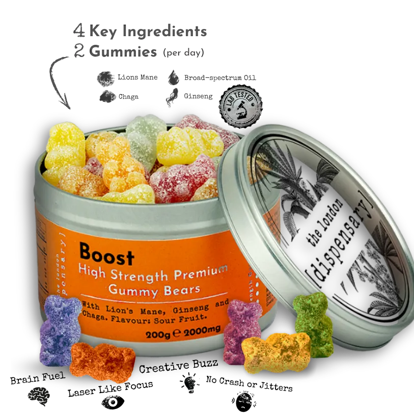 Infused with the highest quality broad-spectrum oil, lion's mane mushroom, ginseng & chaga mushroom.